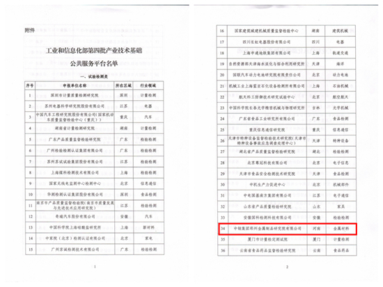 我院获批进入工业和信息化部产业技术基础公共服务平台 近日,工信部公布第四批产业技术基础公共服务平台名单,我院位列其中。 产业技术基础公共服务平台是工信部为了加快实施创新驱动发展战略,落实《中国制造2025》任务要求,保障产业创新发展和质量品牌提升,完善重点产业技术基础体系,优化资源配置,培育并认定的具备权威性、基础性、公益性、前瞻性的技术基础公共服务平台。 服务平台分为试验检测、信息服务两种类型,自2016年至今,全国已有四批共计125家单位获批,其中试验检测类93家、信息服务类32家。我院作为中钢集团首家获批产业技术基础公共服务平台的企业,纳入试验检测类公共服务平台范围,将为相关重点领域的技术创新和产业可持续发展提供质量可靠性试验验证、标准验证与检测、计量检测、认证认可关键技术等基础支撑和公共服务。 我院国家金属制品质量监督检验中心,始终坚持第三方技术机构公正、科学的原则,规范实验室质检工作,不断提高实验室质量保证能力、技术能力和工作质量,凭借健全的实验室质量管理体系、高素质的专业技术队伍、先进齐全的检测仪器设备、强大的检测技术研发能力、悠久的检测经历、资深的检测资质,为国民经济各行业、各领域提供了专业高效的检测技术服务。