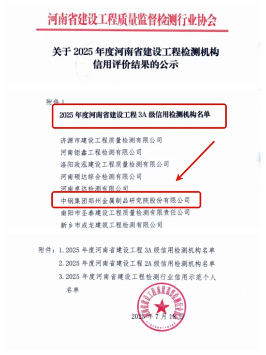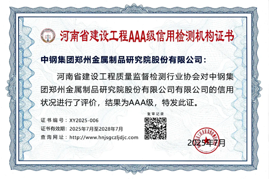中钢制品院荣获2025年度河南省建设工程3A级信用检测机构证书